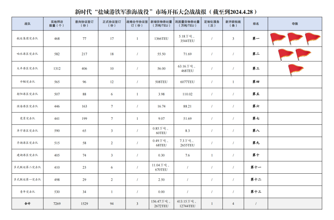 1.累計拜訪客戶數量7269家:其中大豐港區突擊隊1312家,阜寧港區突擊隊590家,響水港區突擊隊582家,巾幗突擊隊565家,青年突擊隊530家,亭湖港區突擊隊515家,射陽港區突擊隊507家,多式聯運第一突擊隊498家,航運集團突擊隊468家,濱海港區突擊隊446家,黨員突擊隊441家,多式聯運第二突擊隊410家,建湖港區突擊隊405家。