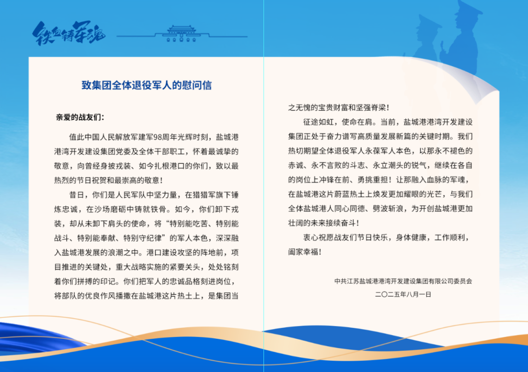 港灣集團、物流集團向奮戰在各崗位的退役軍人同志們送上慰問信,以筆墨傳遞溫暖,以文字致敬榮光,凝聚著對退役軍人“轉業不轉志、退伍不褪色”精神品格的崇高禮贊,飽含著對退役軍人群體“永葆軍人本色、爭當行業標兵”的殷切期許。
