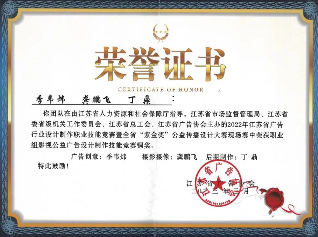 近日,由江蘇省人力資源和社會保障廳指導,江蘇省市場監(jiān)督管理局、江蘇省委省級機關工作委員會、江蘇省總工會、江蘇省廣告協(xié)會主辦的2022年江蘇省廣告行業(yè)設計制作職業(yè)技能競賽暨全省“紫金獎”公益?zhèn)鞑ピO計大賽在南京圓滿收官。鹽城港文旅集團廣告?zhèn)髅椒止緟①悎F隊現(xiàn)場創(chuàng)作的《共圓強國復興夢》短視頻作品大賽榮獲職業(yè)組影視公益廣告設計制作技能競賽銅獎。