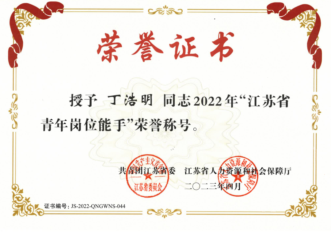 近日,共青團江蘇省委發布《關于公布2022年江蘇?。ń艹觯┣嗄陯徫荒苁终J定結果的通知》,我集團丁浩明同志榮獲“江蘇省青年崗位能手”榮譽稱號。
